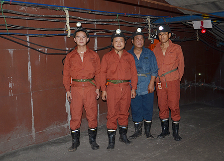 在丰华煤业公司石坝井煤矿,煤矿专业教师贺保平、蔡翰庭、李明杰与娄底职院毕业生、在该矿上班的刘双正就今日井下状况进行交流。“这里矿区比较成熟,管理也很规范。我院多名学生在这上班,从事通风、机电方面技术工作,毕业生唐斌更是担任了技术组组长。”贺保平等人介绍说。
