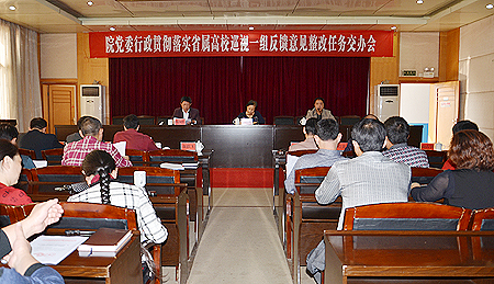 根据省委教育工委统一部署,省属高校巡视一组于今年5月在我院集中巡视检查。9月5日,巡视组专门向我院领导班子通报了巡视情况的反馈意见,并对如何结合实际做好整改工作提出了明确要求。会后,院党委迅速召开专题会议研究落实巡视组反馈意见。我院针对巡视组反馈的几个方面的问题和不足,将整改任务进行分解,要求相关部门坚决落实到位。
