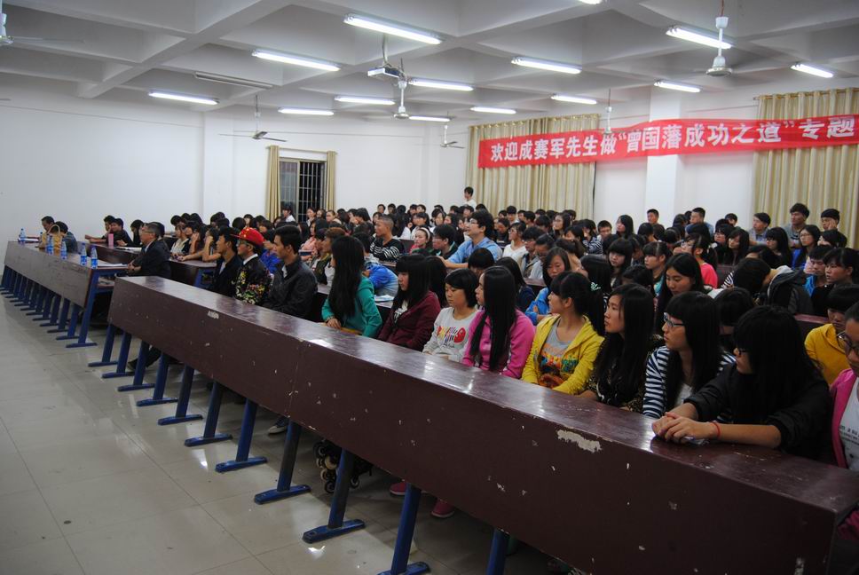 财贸系于10月24日晚特邀请人文科技学院成赛军副研究员为师生主讲“曾国藩成功之道”专题讲座,财贸系党总支书记蒋美群、学工主任刘媛、全体辅导员老师、200余名班团干部以及其他院系部分学生参与了讲座。此专题讲座在主教楼110举行,由学工主任刘媛主持,并要求辅导员和学生干部们认真学习,将精神贯彻到每一位学生。