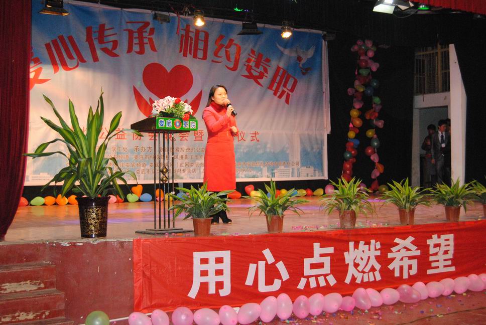 为感恩社会,弘扬中华民族“扶弱济贫,无私奉献”的优良传统,同时为成为有目标,有理想的当代大学生,肩负社会责任,奉献自己的爱心。11月18日晚,财经贸易系燃灯公益协会《爱心传承 相约娄职》晚会庆典暨交接仪式在南苑礼堂举行。娄星区团委书记彭淋琪、学院团委书记欧芳、武装保卫处处长邹涛、财贸系学工主任刘媛、团委老师杨翰如出席了本次交接仪式和庆典。到场的还有燃灯公益协会全体会员、财贸系13级全体同学以及学院各系部现场观看晚会的同学。