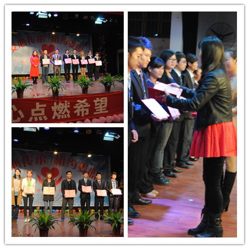 交接仪式上,团委书记欧芳、财贸系学工主任刘媛分别为优秀会员、优秀工作者颁奖并对燃灯公益协会过去取得的成绩表示祝贺。最后团委书记欧芳在致辞中对燃灯公益协会两年来取得的不平凡的成绩给予充分的肯定,希望以后要本着“团结、协调、沟通、服务”的宗旨,为需要帮助的人们搭建“希望之桥”。