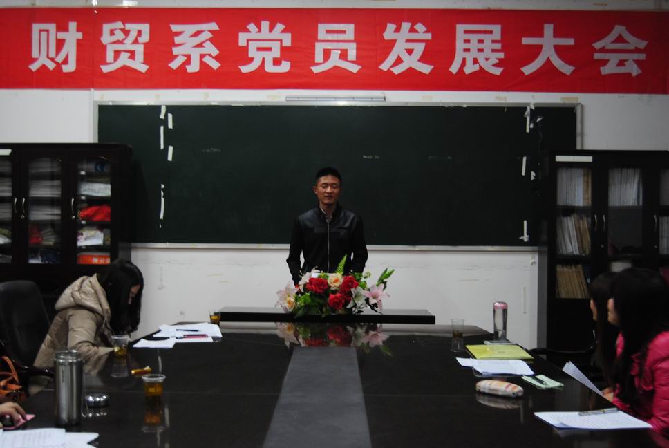 12月12日晚,财贸系预备党员发展大会在实训楼207召开。出席大会的领导有财贸系党总支书记蒋美群,学生党支部书记刘媛,学生党支部宣传委员成柳才,学生党支部组织委员张雯宇、辅导员谭雪晴及全体学生党员和发展对象。