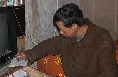 涟源市水洞底镇理珊村是我院的对口扶贫村。该村九组村民邓志辉2008年因患脑梗塞中风偏瘫,并患有心脏病,完全丧失了劳动能力。病痛的折磨加上生活的困苦令他突然失音,无法言语,只能用纸笔与人简单交流。邓志辉育有一女,现已10岁。在女儿一岁时,有智障的邓妻离家出走,再未回家。邓志辉在父亲过世后,与母亲、女儿住在一起。去年,邓母也过世了,目前邓志辉父女两人相依为命,每月只靠100元的低保救济款过活。“买最便宜的米,有时买点菜,有时几个兄弟姐妹送点菜过生活。实在没菜就买白糖拌稀饭吃。买不起肉吃,已经5个月没吃过肉了。”在陆续赶来的邓志辉哥哥、姐姐和村委秘书曾汉英的介绍下,在邓志辉借助粉笔、钢笔写下的几个字和他咿咿呀呀急切的语音中,我们慢慢了解了邓志辉的故事。