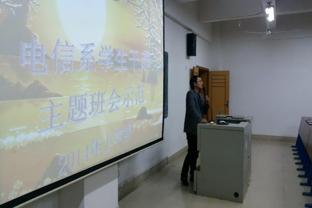 为了提高同学们对参加主题班会与晚自习的兴趣,更好的培养学生干部的团队合作精神。电信系于3月5日晚在主教学楼510开展了学生干部主题班会示范课,学工处副处长戴志鹏、系部学管人员与系主要学生干部一起参加,该系学工主任李规进行示范。