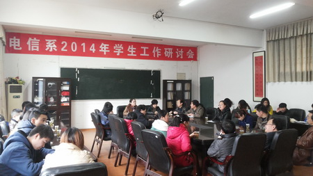 3月6日下午,电信系在实训楼207召开了2014年学生工作研讨会,共同研讨学风与系风建设和如何提高学生的学习积极性,全体系领导、各专业教研室主任、辅导员与20名学生代表参加研讨会,会议由系党总支书记吴莲贵主持。