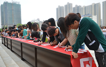 心理健康教育中心阳帆老师首先宣读本次心理健康节活动方案,并鼓励同学们积极参与心理健康活动。随后,学生代表谢乐同学宣读倡议书,她倡议“给心灵多一份关注,给自己多一点勇气,给友谊多一点温暖”。全体学生在“构筑心灵天空 凝聚爱的力量 你我携手共进”红幅上签名,积极响应了她的倡议。