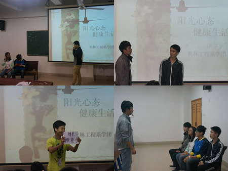 5月12日早,农林系于新培训楼前举行第九届“5.25心理健康教育节”启动仪式,该系副主任易瑜,学管干事颜勤,辅导员王琦、朱静姝、徐艺和全体同学出席启动仪式。 该系学团心教部杨聪迪部长宣读了活动倡议书,她倡议“给心灵多一份关注,给自己多一点勇气,给友谊多一点温暖”。易瑜安排布署我系心理健康教育节的工作,简要介绍了将要举行的系列活动。她提出健康的人生应该保持豁达宽容、平和宁静、积极乐观的心理。健康的心理是可以通过自己的理想、价值观和生活态度的调整,不断培养自己的进取心和挫折承受能力获得的,提高自我和谐、人际和谐及与社会、自然和谐相处的能力,怀着积极的心态去认识生活意义,热爱生活,这样的人生才有意义。 ![]() ![]() ![]() ![]() 征文比赛 为更好的普及大学生心理健康知识,传播心理健康理念,使大学生更加关注自己和他人心理健康,提高自身心理健康水平,农林系于5月12日至20日成功举办了心理健康征文比赛。 学院本次心理健康征文以“关爱自己,关爱朋友”为主题,目的是全方位反映当代大学生的学习生活,走进身边人的内心世界,培养大学生健康,积极,上进的人生态度。在此次征文中同学们热情抒写青春的激情,挥洒生命的脉搏。作品不仅对当代大学生心理健康问题做了深刻的分析,而且强调了心理健康在大学生日常生活学习中的重要性,观点鲜明,立意独特。经过严格评审,来自12园林(设计)一班任莉的《愿我的世界总有你的二分之一,一起同行》、12园林(工程)班耿岳的《青春-朋友》等在众多参赛作品中脱颖而出,被推荐参加学院第九届“5.25大学生心理健康教育节”有奖征文活动。 本次活动同学们参与意识高,作品内容生动健康,题材广泛,进一步增强了大学生的心理健康意识,普及了心理健康知识,优化了同学们心理品质,取得了积极的成效。(易非 管皓云) 心理宣泄会 5月21日晚,农林系于主教楼510召开以“阳光心态,健康生活”为主题的学团干部心理宣泄会。出席本次会议的有学工处副主任易瑜,学管干事颜勤,系学团全体干部,各班班团主要干部。 活动之初,大家一起观赏了由学团干部表演的来源于自己真实生活的心理情景剧《生活里的哪些事》,原汁原味的三个情景表演引起了台下各级学团干部的共鸣,赢得了热烈的掌声。 观剧之后,各级学团干部积极上台发言,倾诉工作中遇到的各种不理解、不配合,如:男女生部干部们说到,查寝查卫生时同学们的不配合,因查晚归夜不归时不得不晚睡等烦恼;体育部、学习部干部们表示查操、查堂也不是件简单的事……大家纷纷表示面对各种各样的工作问题时,作为一名干部愿意以身作则,说出自己的难处,希望得到班团干部们的配合以便系学团工作能更好的开展。12畜牧一班班长周恭勋、12畜牧二班班长仁青曲增分享了做为班长所承受的来自学管和学生的双重压力,真诚向在工作中承受了自己负能量的系学团干部们表示感谢和道歉,在以后的工作中发现问题时,尽力去解决;当自己有情绪有烦恼时,学会去寻找自己的调节方法。 会议最后由学工易瑜总结: 心理键康是衡量大学生综合素质的一个重要方面,随着社会的发展变化,大学生心理健康状况受到越来越多的关注。作为大学生中的特殊群体,学生干部的心理状况更应受到重视。大家除了要面对学业压力、就业压力,此外,还有老师、同学交付的各项工作,以及各种活动和各种评比。从某方面来说,活动和评比的结果代表了学生干部的工作成绩,这样造成大家要面对多重压力,比普通同学的压力更大,更容易出现诸如精神高度紧张、焦虑、抑郁、恐惧等各种心理问题。所以,今天我们来开一次“情绪宣泄会”,把平常工作中受到的委屈、不理解、压力都发泄出来,然后重新以积极饱满的精神状态继续“上路”。 离开会场时,大家步履轻松,相信我们能如易主任所愿:积极饱满的继续上路!(易瑜 耿岳 谢冬燕 管皓云) ![]() 情景剧表演 ![]() 系学团干部们倾诉 ![]() 各班团干部们发言 ![]() 易瑜讲话 ![]() 会场 | |