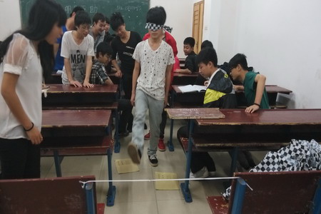 本次趣味心理健康主题班会各班分为“盲人旅行”、“勇于承担责任”和“幽默乐观”三个游戏环节来开展。在开展“盲人旅行”游戏前,各班利用绳子、书本、凳子等物品做为障碍将教室里的过道设置为一根根盲道,同学们二人一组,其中一位同学带着眼罩扮演“盲人”,而另外一位同学则扮演“拐棍”手牵手来帮助“盲人”完成教室里有障碍的旅行,游戏中,同学们互相体验,通过“盲人旅行”游戏同学们相互感受到自助与他助、信任与被信任、爱与被爱的幸福与快乐。
