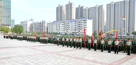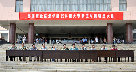 8月29日下午,我院2014级大专新生军训动员大会在学院文化广场隆重举行。我院副院长周志和、武警娄底支队副政委伍汉华、保卫处处长张明、团委书记欧芳、各系部党总支书记、军训总教官周庆峰在主席台就坐。2014级全体新生、各系部辅导员与军训教官参加大会。大会由张明主持。