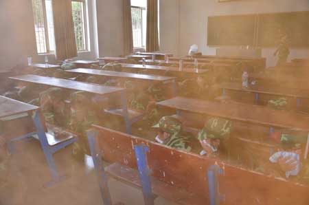 30秒后,地震警报结束,现场燃起刺鼻的烟雾,学生在教官的组织指挥下,有秩序地从教学楼内疏散到了指定地点集结。由于各班级高度重视,全体参与人员密切配合,整个演练过程严肃、紧张、安全、迅速、有序,数千名参与演练的学生在5分钟内全部安全撤离疏散,演练达到了预期目的。
