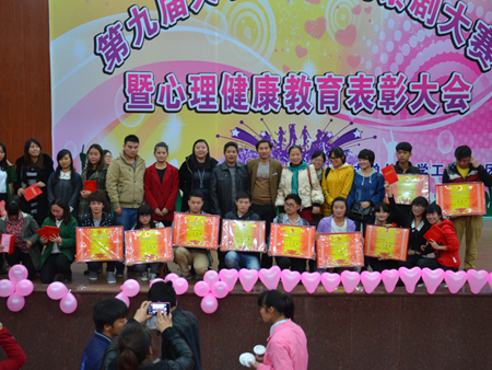 表彰大会由外语系带来的舞蹈《小苹果》拉开序幕。随后由各系部推荐的大学生心理情景剧相继上演。本次心理情景剧参赛作品分别从友情、亲情、爱情、学业、前途等方面诠释了当代大学生的内心世界和情感需求。演员们通过生动的语言和形象的表演,将大学生活的不适应、迷茫、烦恼、直至确定目标等过程展现得淋漓尽致。其中财贸系表演的《因为我们是一家人》将本次比赛推向高潮,剧本根据系部的真实故事改编,情节动人,表演到位,得到了评委和观众的一致好评,荣获此次比赛一等奖。其他代表队表现各有千秋,汽车学院的《墨镜墨镜》、电信系《中国好室友》荣获二等奖,建艺系《心灵的抉择》、农林系《爱在屋檐下》、公管系《心的距离》获三等奖,机电系《寝室生活》获优胜奖。