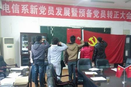 12月11日,电信系在实训楼207举行新党员发展暨预备党员转正大会,参与会议的人员有电信系11、12级预备党员8人及12、13级的8名入党积极分子。参加会议的领导有:系党委书记李济民,系主任刘罗仁,系学工主任刘寿松,谢完成老师,辅导员李韶辉,佘彬等8名正式党员。