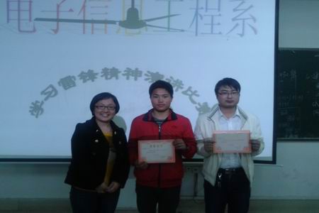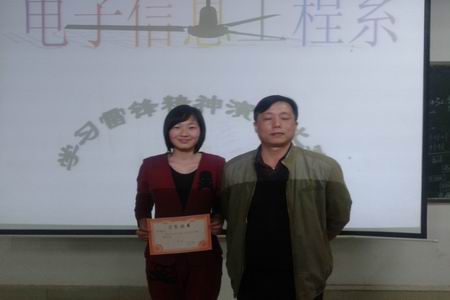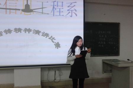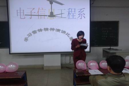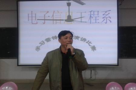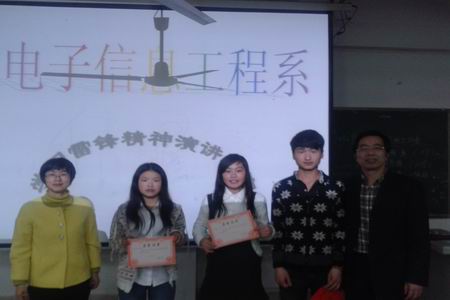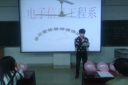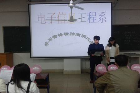 3月30日晚,电信系在主教楼410举行“学习雷锋精神演讲比赛”。出席本场比赛的领导有电信系学工主任刘寿松,学工干事李欣欣,13级辅导员李韶辉,14级辅导员彭继光。14级所有班级作为比赛观众。