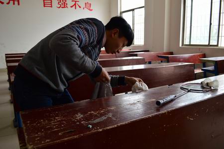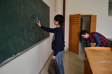 在经过了两个半小时的打扫后,同学们都累的大汗淋淋,但是看着干净的主教楼脸上都露出了满意的笑容,最后在检查一遍是否全部干净以后,才放心的回到了寝室。