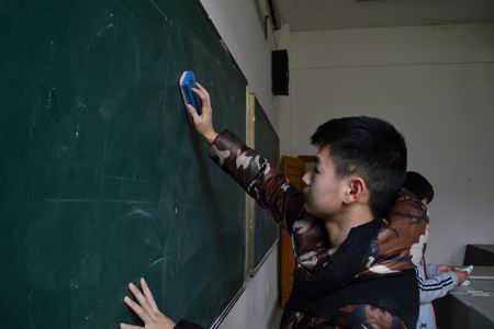 在主教楼中同学们都非常主动的清理起了身边的垃圾,桌子、座位上有垃圾就用手中的袋子将垃圾清理掉,黑板没有擦干净就用抹布擦干净,讲台上东西乱糟糟的就将桌子整理好,同学们都充满了干劲,有地方不干净就冲上去打扫干净。