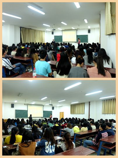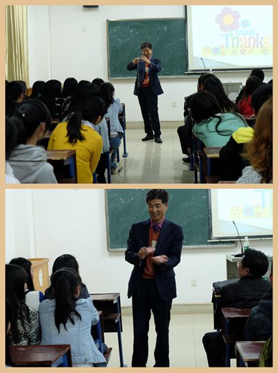 4月14日晚7:00在主教楼620教室,外语系举行国际商务礼仪讲座。由韩国教授Yong?Dtake Lim主讲,他毕业于韩国全北国立大学,获经济学博士学位,现就职于韩国群山国立大学,主要从事国际贸易、电子商务、国际商务礼仪研究。此讲座参加者有湖南人文科技学院国际交流处处长蒋冰清,外语系主任刘燕、教学主任肖付良、学工主任贺建良、辅导员周春红以及外语系全体学生。