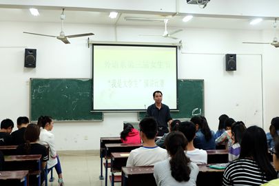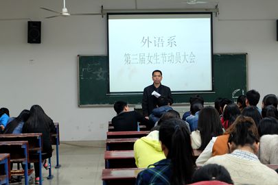为倡导外语系女生树立崇高理想,加强内涵修养,培养高雅情趣,4月12日晚,外语系在主教楼318开展第三届女生节动员大会,参加者有学工主任贺建良、辅导员周春红老师以及外语系全体学生。