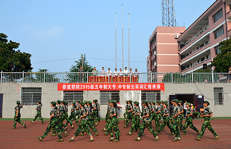 8月25日,我院中专部2015级全体新生列队齐聚田径场,为期10天的军事训练在今天进行成果验收。我院院长雷立成、副院长郭广军,市教育局副局长张怡南、职教科科长罗凤初、资助中心主任李松洲,我院中专部主任邱正文、党总支书记谢新茂、保卫处处长张明及军训总教官邬迎春出席并在主席台就座。22名军训教官,中专部全体班主任、2015级全体新生参加军训汇报表演。仪式由谢新茂主持。