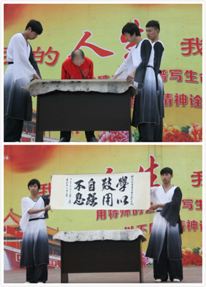 演出中,娄底职院学生代表上台接受了“心灵之声”艺术团赠送的书法作品――娄底职院院训“学以致用 自强不息”,院领导及各系部处室代表还纷纷捐款献爱心,代表全院师生对参加表演的残疾演员表示了真挚的感谢和敬意。(宣传部)