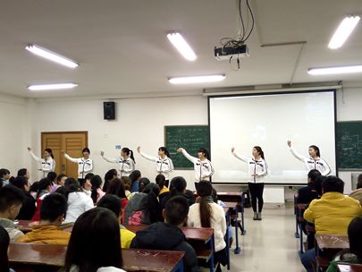 活动第二项是13级应教班学生进行课堂演习。首先,是两位同学分别进行课堂教学,课堂一开始“老师”就以问候的方式调动气氛,在座的“同学们”都很认真听讲,现场气氛活跃。两位同学各具自己的教育特色和风格,以提问、师生互动、搭档对话、分组比赛、带读等各式各样的方式来推动学生学习,用黑板展示或PPT等不同方式来讲解,突出了各自的授课特点,hold住全场一百多名“学生”,让每位“学生”都听得津津有味。随后,便是应教班学生进行汇报演出,各组都以不同的特色全程用英语来表演,诗朗诵、舞蹈、小故事、唱歌等,通俗易懂却又惟妙惟肖,服装也很统一,整体掌控得非常地好。活动一个接一个,丰富多彩,让在座的同学们有种意犹未尽的感觉。