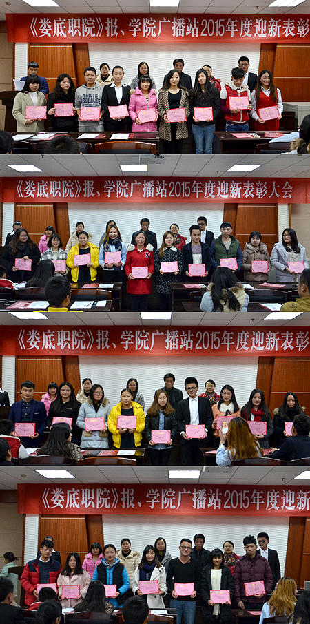 12月18日下午,《娄底职院》报、学院广播站2015年度迎新表彰大会在综合楼一楼会议室举行。宣传统战部部长王宗凡,宣传统战部老师刘艳、李莉、欧阳琦及院报记者站站长吴萍、广播站站长刘煌出席,院报、广播站全体成员参加。大会还邀请了院学生会主席团、院团委、社联主席团、院学生会宣传部代表参加。