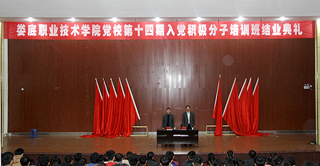 | 12月24日,我院党校第14期入党积极分子培训班结业典礼在新培训楼报告厅举行。党委委员、副院长颜彩飞,党委委员、党校校长、组织人事处处长梁凌洁出席,学院党校、分校和各系党支部等部门有关人员、全体学员参加。典礼由梁凌洁主持。 在庄严的国歌声中,结业典礼正式开始。颜彩飞作重要讲话。他表示,学员们经过半个月的认真学习、积极实践,圆满完成了各项培训任务,此次培训班呈现出三个特点:一是组织精心细致;二是内容丰富,授课形式多样;三是学员学习态度端正,脚踏实地,以实际行动在向党组织靠拢。经过培训,学员们进一步坚定了理想信念,进一步端正了入党动机,进一步找到了存在的差距,明确了今后努力的方向。颜彩飞希望全体学员能继续努力学习党的基本理论知识,用先进的思想武装自己的头脑;全面提高自身素质,时刻发挥模范作用;不断端正入党动机,解决好为什么要入党的问题。 领导为学员颁发了结业证书。颜彩飞宣读培训班优秀学员名单,梁凌洁、颜彩飞一起为其颁发荣誉证书。 最后,梁凌洁宣布第14期入党积极分子培训班结业典礼结束。 本期培训班共有881名学员从学院党校结业,48人荣获“优秀学员”称号。(李莉 曾璐瑶 林玉美)