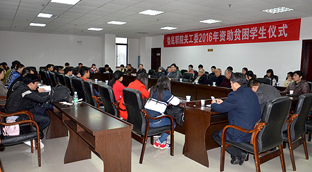 3月8日上午,我院关工委2016年资助贫困学生仪式在综合楼二楼招聘大厅举行。副院长周志和、学工处处长欧芳、院关工委老领导、各系学工主任出席资助仪式,受资助的43名学生参加。仪式由院关工委秘书长贺汉雄主持。