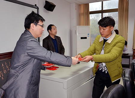 会上,贺汉雄宣读了受到资助的43名学生名单,每名学子均获得1000元资助,周志和逐一为他们发放资助金。