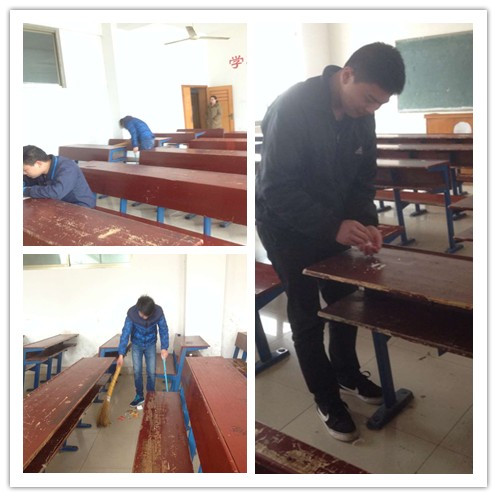 | | | | | | | | | 为了提高财贸系学生的综合素质, 3 月 10 日下午四点,财贸系素质教育第四期培训班开班 。本次活动的主题是“教室是我家 人人爱护它 ”,以义务劳动的形式在主教楼开展。本次活动由辅导员陈为老师主持,主要是针对财贸系教育量化考核排名靠后的学生。 陈为老师将同学们分为 6 组,由学生会的同学带队,分别到主教楼 1-3 层的每个教室清扫课桌、走廊以及擦黑板。 在进行清扫过程中同学们积极参与,充分体现了同学们的良好状态,虽然在清扫任务并不艰巨,但是还是达到了本次活动的目的,也使同学们学到了很多的东西。同时,也为同学们提供了舒适、优雅的学习环境。 本次素质教育义务劳动活动的开展,使同学们意识到了素质学分对我们的重要性和日常行为规范与综合素质提升的必要性,同时也提高了参加本次活动人员做事的积极性。 ( 郭杨阳 ) 辅导员陈为主持 学生清扫教室 | | | | |