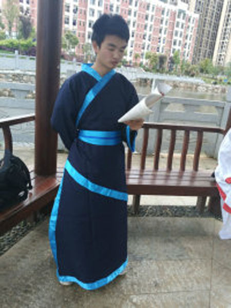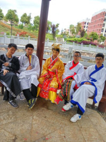 话剧社的成员以古人户外的读书方式读书、学习古人走路姿势及欣赏周围景色,仿佛将我们带回了古代,感受到了古人的气息。(电信系)