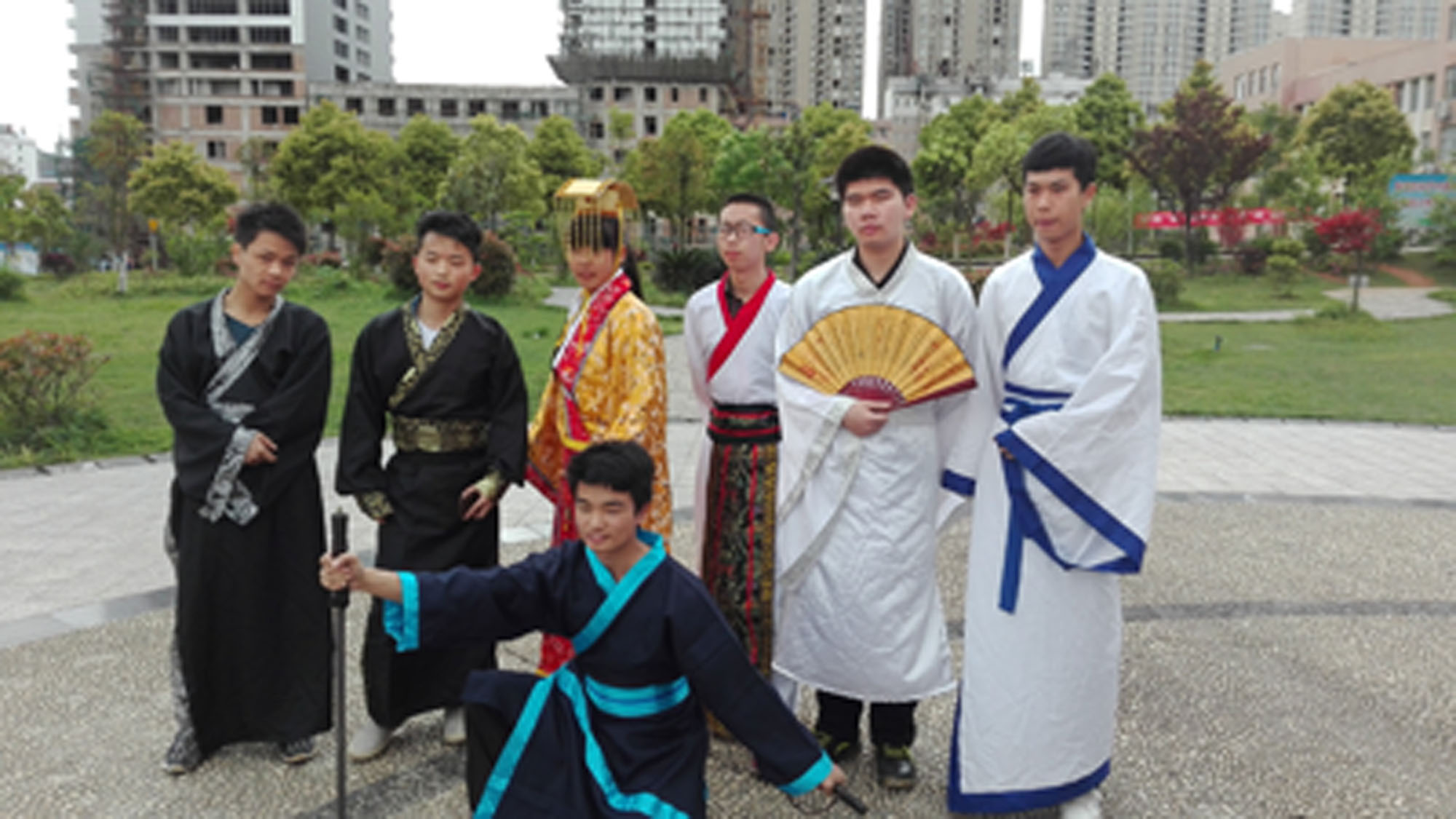 4 16 号,话剧社在励志广场集合准备举办一场户外汉服秀,这场由话剧社社长戴湘惠总负责的户外秀在文化广场、励志广场、主教楼、主教楼后的树林以及北苑乒乓球场地呈现给我们。