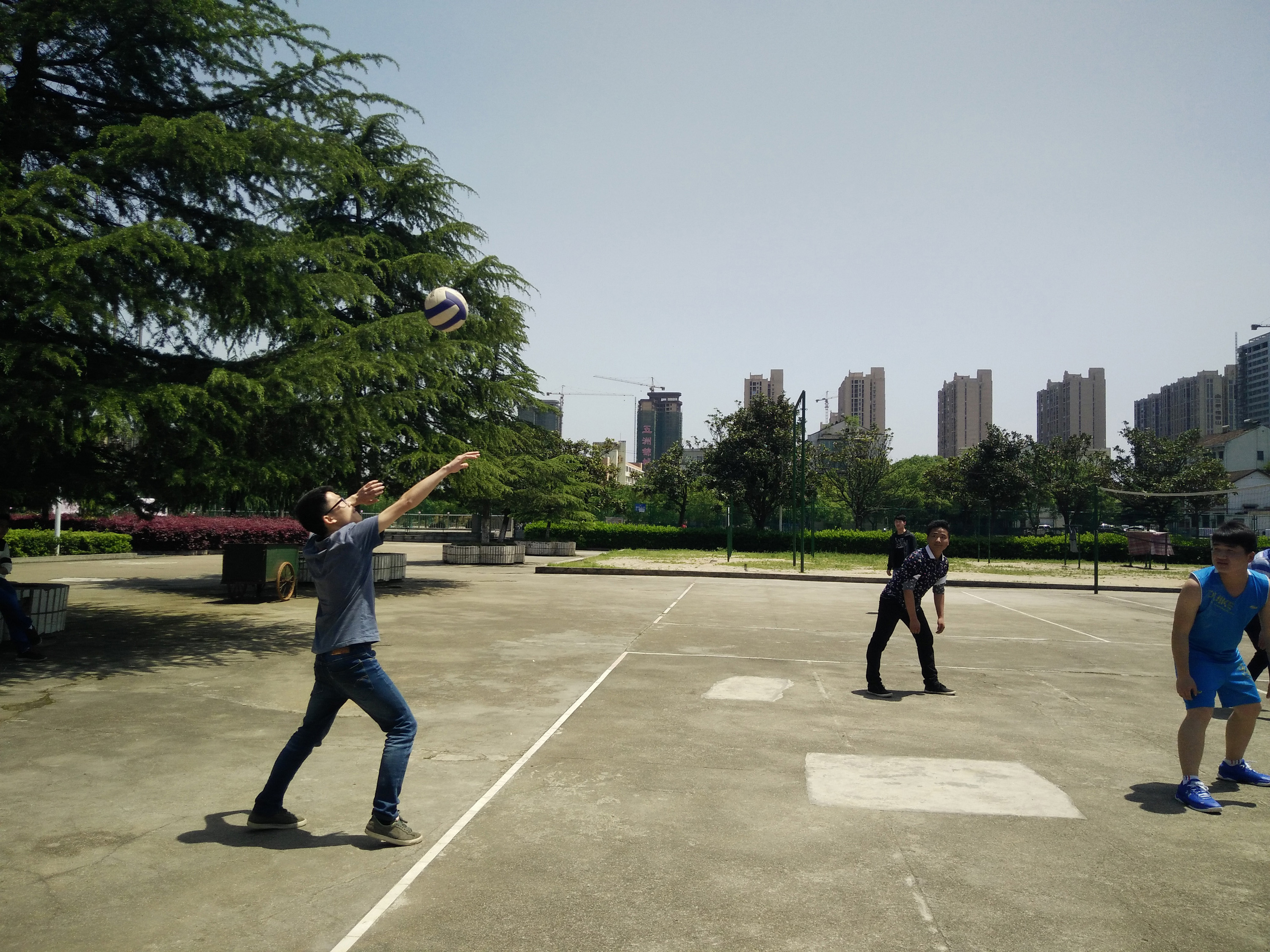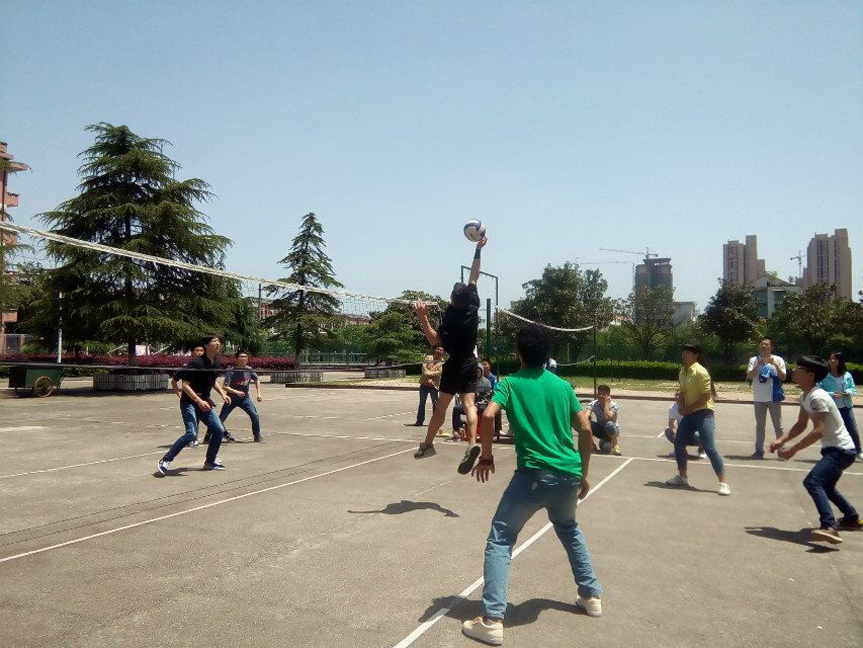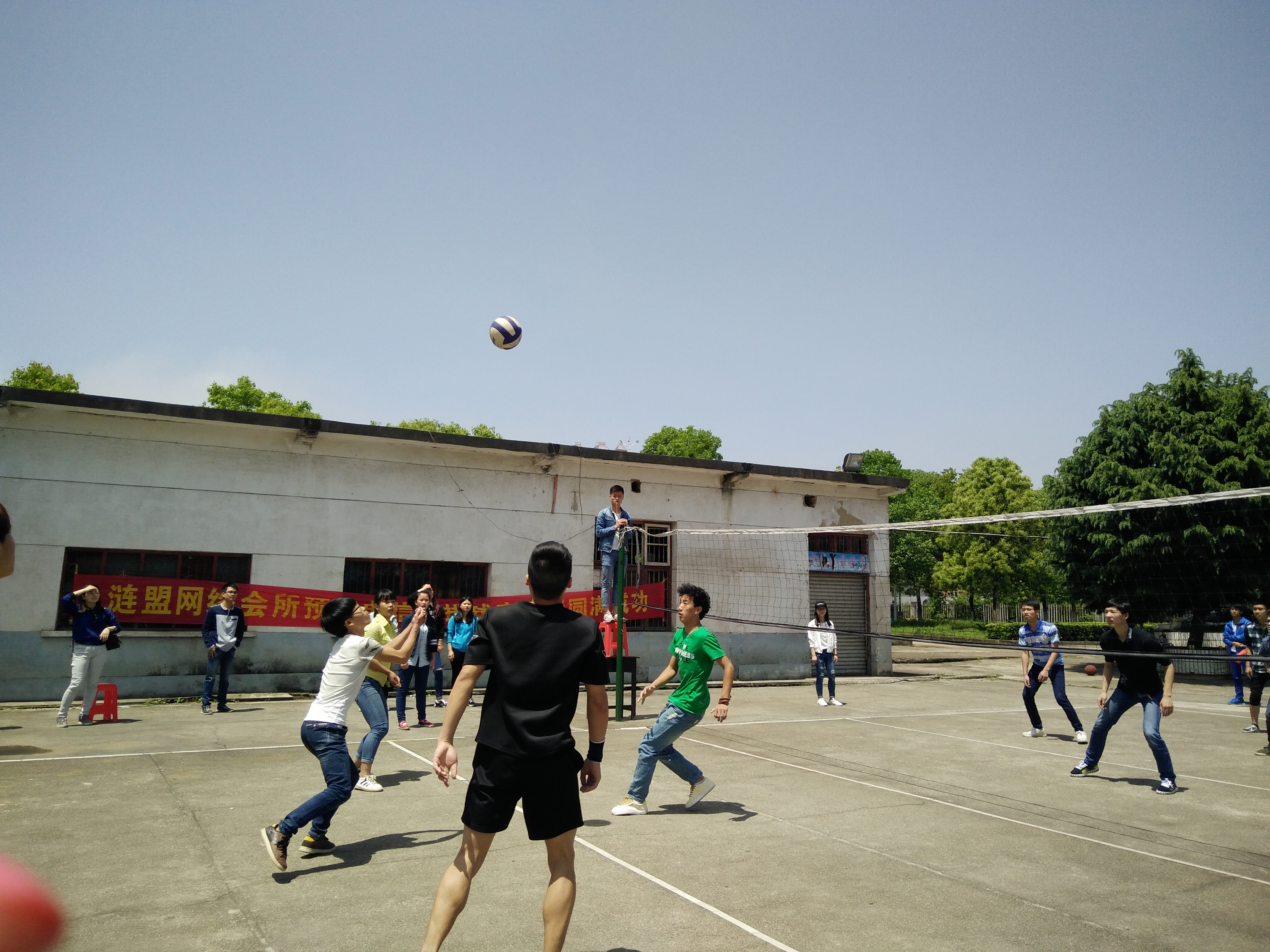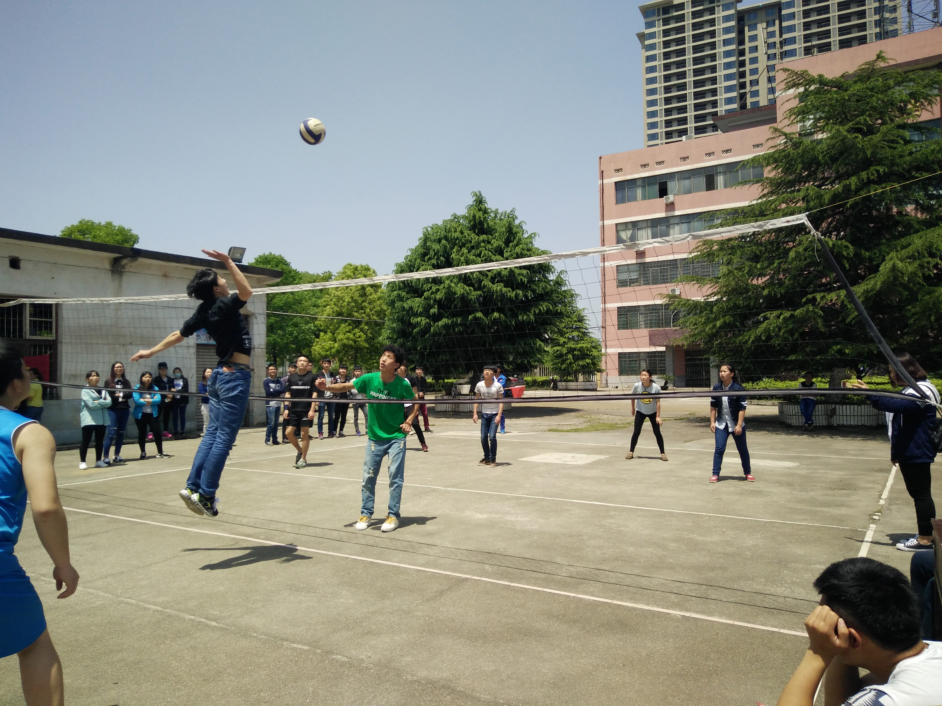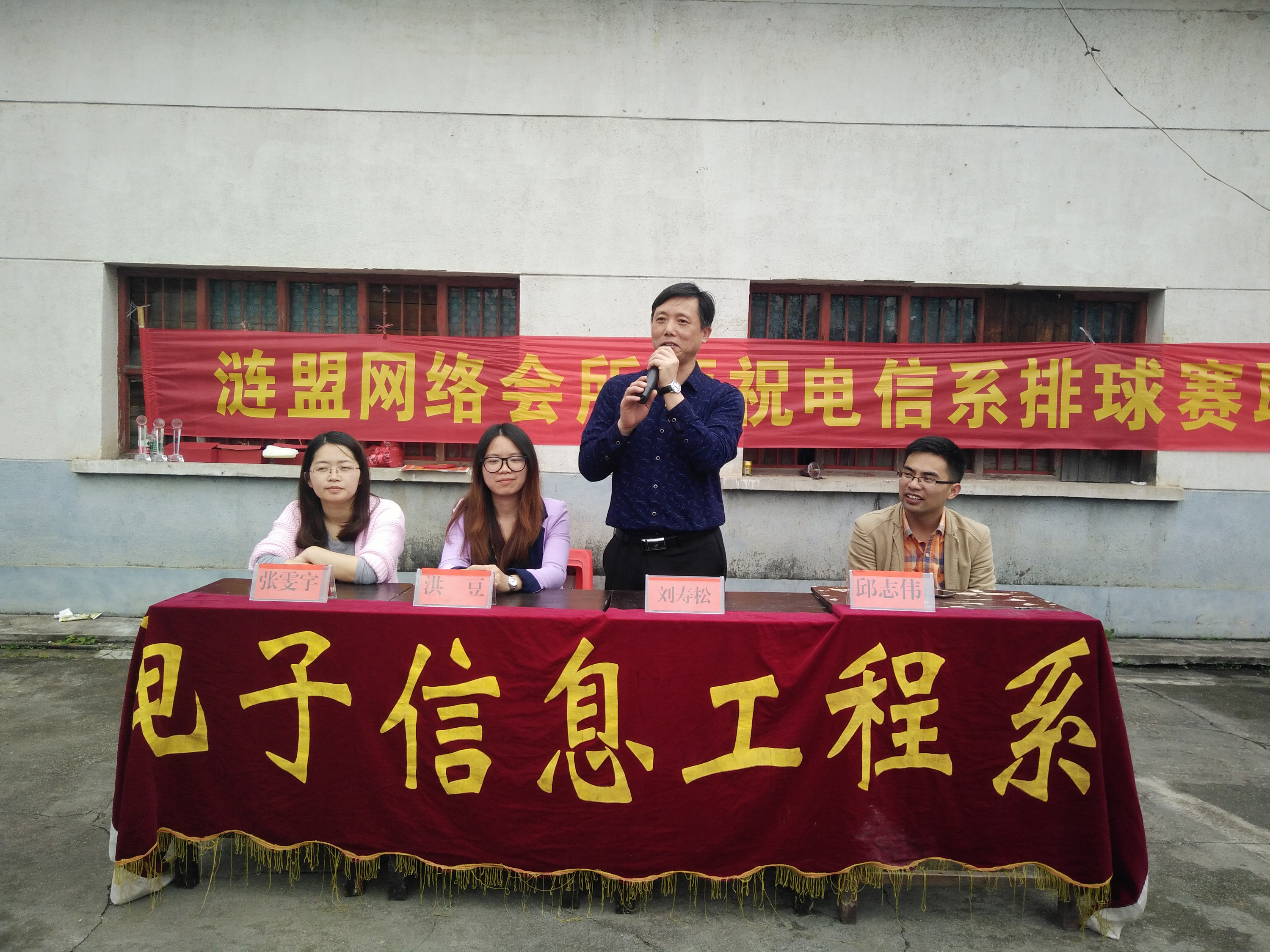 4 20 号中午十二点整,电信系各班排球队在排球场进行决赛比拼,届时,电信系学工主任刘寿松,学生干事洪豆, 14 级辅导员彭继光, 15 级辅导员邱志伟和张雯宇以及学生会团总支全体成员到现场观看比赛并为排球队加油助威。