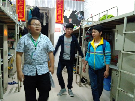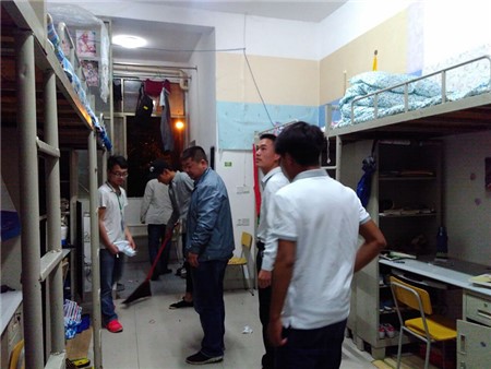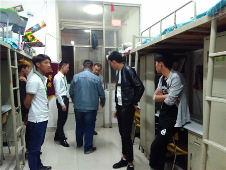 朱静姝与徐艺老师在女生部的部长陪同下对女生宿舍进行了排查,朱勇志与王琦老师在男生部与保卫部的陪同下对男生宿舍进行了排查。在主任与辅导员们来到宿舍时,所有的同学都表示非常欢迎,老师们对学生们对学习校的规章制度的看法与平时的生活进行了了解。