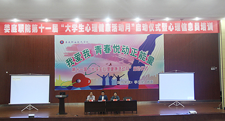5月25日,我院第十一届“大学生心理健康活动月”启动仪式暨心理信息员培训在新培训楼学术报告厅顺利举行,副院长周志和,院学工处处长、团委书记欧芳,学工处副处长易瑜、李规在主席台就坐,全院各系学工主任、各班心理委员和心理信息员参加此次活动,仪式由欧芳主持。