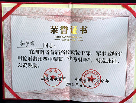 6月4日,湖南省首届高校武装干部、军事教师军用枪射击比赛在湖南警察学院射击馆举行,我院代表队与来自全省36所高校的108名教师队员进行激烈角逐,最终荣获团体一等奖、两个“优秀射手”奖。此为我院首次组队与全省本科、高职院校一同参赛竞技,荣获“优秀射手”奖之一的杨梦辉老师更以90环的优异成绩排名全省第二。