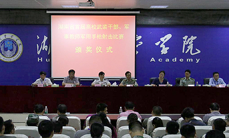 此次活动由湖南省教育厅、湖南省军区司令部联合主办,湖南警察学院承办,旨在提高全省高校武装干部、军事教师的军事水平和军事射击能力。我院代表队由保卫处处长张明领队,杨立雄为教练,杨梦辉、黄德胜、谢冰、李威军等四名队员参加,在36支参赛队伍中脱颖而出,以明显优势摘得团体一等奖桂冠,参赛队员杨梦辉、黄德胜也以优异成绩荣获个人“优秀射手”奖。当天下午大赛举行了隆重的颁奖仪式,湖南省教育厅副厅长应若平、湖南省军区副参谋长胡代松出席并给获奖代表队与个人颁奖。
