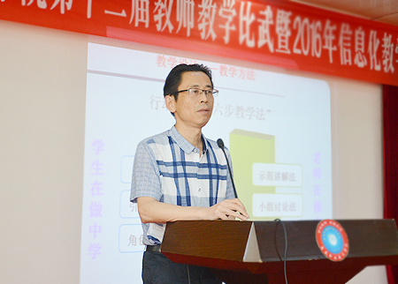 副院长龙伟做点评讲话。他认为,今天的比赛很精彩,今天的比赛领导非常重视,书记、院长亲临赛场并作重要讲话,在家的全体院领导观摩比赛并将为获奖选手颁奖;今天的比赛既让我们真切地感受到了信息化给我院教学工作带来的新变化、新气象,又让我们欣喜地看到了19位参赛选手在信息化教学工作方面的新探索、新成果。整个比赛组织有力、参赛有心、评赛有据、观赛有序,基本达到了交流经验、展示成果、促进应用、提高水平的大赛预期。同时,他从“长”、“短”、“扬长补短”三个方面对今天的决赛做了点评。首先,他充分肯定了今天信息化教学设计决赛之“长”:一是有“人”,即围绕“人”的维度进行教学设计。二是有“物”,即围绕“物”的维度进行教学设计。三是有“事”,即围绕“事”的维度进行教学设计。四是有“境”,即围绕“境”的维度进行教学设计。五是有“脉”,即围绕“脉”的维度进行教学设计。六是有“创”,即围绕“创”的维度进行教学设计。其次,他分析指出了此次信息化教学设计比赛在教学理念、教学目标确定、整个教学过程设计完整性、情境设计的科学性、学习情况掌握的有效性等方面有差距之“短”。最后,就如何“扬长补短”他明确提出了今后我院强力推进信息化教学创新的主攻方向和具体举措,就是要进一步加大信息化教学有效性的研究与规范力度,努力提高信息化教学的针对性与有效性;要进一步加大信息化环境下创新教学方式和学习方式的激励与保障力度,努力探索师生积极互动的信息化教学新模式;要进一步加大教师信息化教学能力培训与测评的力度,努力提高教师信息化教学能力与水平;要进一步加大数字化优质教学资源开发与应用的力度,努力形成数字化优质教学资源在课堂教学中深入普遍持久运用的机制;要进一步拓宽信息化教学大赛的参赛面,把握规律性,凸显创新性,提高实效性,努力完善以赛促建、以赛促教、以赛促改的常态化机制。