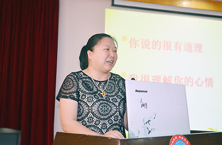 袁红梅老师从两个方面进行了讲解。她首先回顾了高校心理健康教育与思想政治教育的三十年历程,然后以自己咨询工作的一个经历导入,从如何建立良好的访谈关系、应用非言语行为、参与性技术和影响性技术等四个方面讲解了如何与学生谈话以拉近与学生的情感距离。“重要的不是说什么,而是如何说!”袁红梅认为,首先要遵循尊重、热情、真诚与共情的原则,与学生建立良好的访谈关系;其次要充分运用好手势、眼神、表情、声音与着装等非言语行为,营造良好的沟通氛围;第三,要学会运用倾听、提问、鼓励和重复、内容与情感反应等参与性技术,提高沟通的有效性;第四,运用解释、指导、情感与内容表达、自我开放等影响性技术,提升谈话的效果。最后袁红梅老师送给大家在学生工作中可以常说的两句话:“你说的很有道理”、“我很理解你的心情”。讲座中,袁老师结合多年来的工作经验,大量例举了学生中出现的典型案例,风趣幽默、深入浅出地阐述了如何运用心理学的原理与方法提高工作水平,令与会者获益匪浅。讲座在阵阵热烈的掌声中结束。