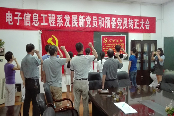 最后,由党支部成员经过一致表决,批准向恩贵、蒋慧,李镓芹,刘峥嵘,曲珍5名同学转为预备党员,并由张雯宇老师领读入党誓词。(电信系)