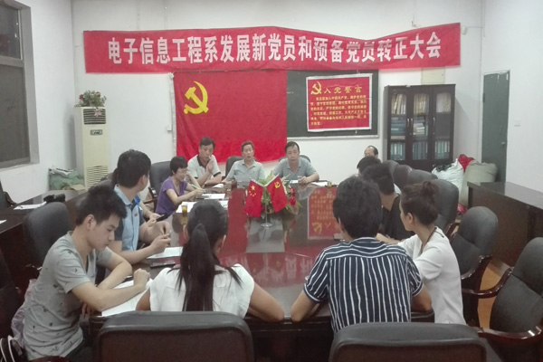 6月8日晚7点30分,电信系于实训楼207举行电子信息工程系预备党员转正大会,此次会议到场的党支部成员有电信系党支部书记李济民,系主任刘罗仁,学工主任刘寿松,教学主任谢完成,13级辅导员李韶辉,15级辅导员张雯宇,到会的人员有预备党员周戈、周勇、姚江艳、李庆、陈思贤、聂俊红、易伟等。