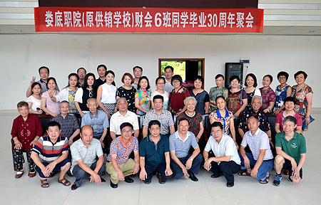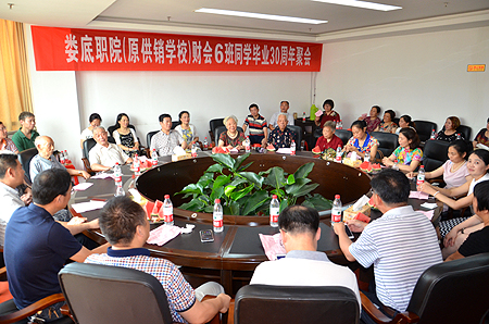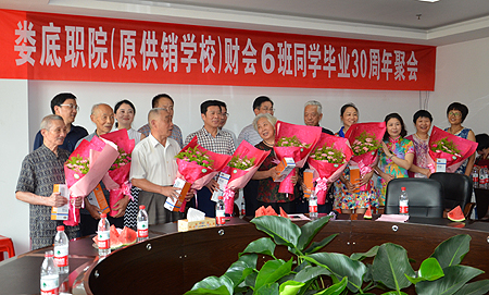 7月10日,娄底职院(原供销学校)财会6班校友毕业30周年回到母校欢聚,座谈会在综合楼312会议室举行,副院长刘自斌,学院老领导朱建国,党政办副主任罗平良,原财会6班班主任吴丽娟,原任课教师代表李晃、李玉捷、彭明达、刘功等参加了座谈会。原财会6班班长曾瑞庭主持。