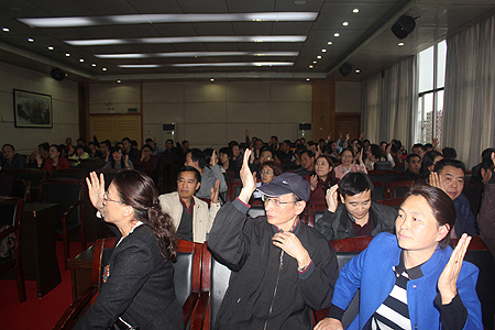 副院长、教师村团购业主委员会主任周志和对我院教师村的建设情况作了说明,副院长颜彩飞宣读了娄底职院教师村团购业主委员会拟新增成员名单。我院教师村团购业主委员会拟新增业主代表43人,总人数达到73人(原有代表33人,其中3人因个人原因主动辞去代表职务)。经过与会代表举手表决,教师村团购业主委员会新增成员名单顺利通过。