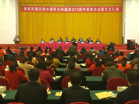 省政协常委、民盟湖南省委专职副主委胡颖,娄底市政协主席姚兵,中共娄底市委常委、市委统战部部长王雄,市政协副主席、九三学社娄底市委主委刘继清出席会议或讲话。娄底市政协副主席、民盟娄底市委主委邵瑛作大会主题报告。娄底市政协副主席、民盟娄底市委副主委肖扬主持会议。近200名盟员代表齐聚一堂,共同回顾中国民主同盟75年来的光辉历程,展望民盟事业发展的美好前景。(刘艳)