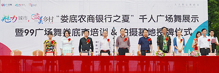 为深入贯彻落实《全民健身计划》,推动娄底市全民健身运动深入发展,5月6日上午,“娄底农商银行之夏”千人广场舞展示暨99广场舞娄底培训拍摄基地授牌仪式在娄底市体育中心室外田径场拉开帷幕。市委宣传部常务副部长刘道阳、市民政局副局长陈灿辉、市文体广新局副局长梁征强等出席仪式。刘道阳宣布活动开幕。