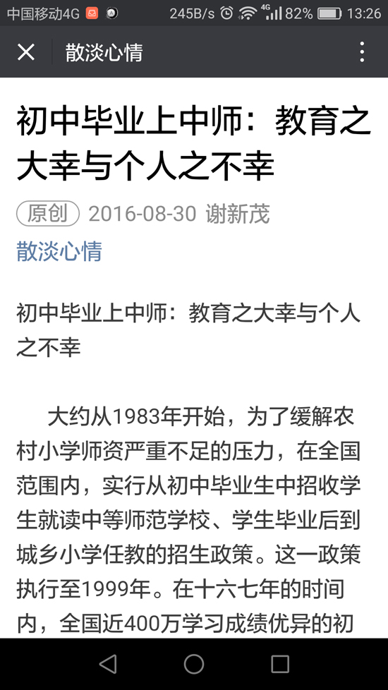 “散淡心情”微信公众号是他在2016年7月12日开通的。“业余时间没别的爱好,就喜欢写点散文。写的多了,就想着找个地方存起来,就开了这个微信公众号,全是我的原创作品。”谢新茂介绍说。开始一两个月,文章的阅读量一般在400-1200次左右,读者主要是他的学生和朋友、同事,粉丝约600人。谢新茂曾在冷水江师范教书十多年,他的同事、学生经常与他联系,畅聊境况。2016年暑假,谢新茂应邀参与他的“开门”中师学生毕业三十周年聚会筹划工作,心有触动,8月30日,他推出了《初中毕业上中师:教育之大幸与个人之不幸》,这篇微文依托他的亲身经历,站在国家宏观政策的角度叙述了中师生这一群体的前世今生,“写的比较走心”。 他的同事、朋友、学生大量转发,当天晚上,该文阅读量即达2200多,第二天晚上即达22万,让此文一下成为“热文”。许多读者在文下留言。其中“南郭书生”看着看着泪流满面,“本人87年毕业,毕业后在偏远小学、中学工作了十多年,因为师范不开英语课,等于就砍掉了我们这些学生上升的翅膀。我没有放弃梦想,一直不断努力,付出了常人数倍的血与汗,中国的所有学制我都读过,最后谋到了一个省城不入流的大学教职,所以从小学、初中、高中,一直教到了大学。其中甘苦,常人难以想象!向所有中师生致敬!”……到现在,还有读者在转发该文。谢新茂老师还将留言整理后编辑了专门的微文推发。