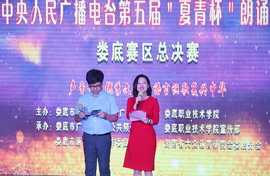 第五届夏青杯朗诵大赛暨湖南第三届语言艺术节(大赛)娄底赛区选拔赛由娄底市教育局、娄底广播电视台、娄底职业技术学院主办,娄底市广播电视台公共频道、娄底职业技术学院宣传部、娄底市语言文字工作委员会、湖南省大众语言艺术研究会娄底联络处承办。本次总决赛邀请了省大众语言艺术研究会会长黄河、副会长蒋维以及胡丽鸿、颜坤等省市著名的语言艺术类专家担任本次赛事的评委。娄底市委宣传部常务副部长刘道阳,市教育局党组书记、局长李耀文,市广播电视台党组书记、台长谢福兴,娄底职业技术学院党委副书记王健龙等领导到场观摩指导。我校宣传统战部部长王宗凡、团委书记刘媛出席。