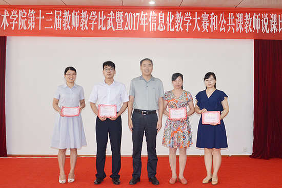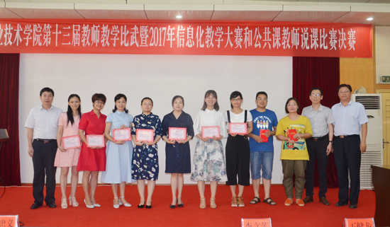 23名参赛选手的表现精彩纷呈,充分展示了我院教师在信息化教学改革方面的探索实践及所取得的进展与成果,全面汇报了我院公共课以服务专业为目标开展的课程改革与建设情况。经过评委的认真评审,李权、辜桃老师荣获信息化教学设计比赛一等奖,祝青、胡小红、夏美莲、丁祎、黄婷老师获得二等奖,周凌博、王豪、汤敏捷、肖艺欢、刘玉玲、吴光辉、廖秀华老师获得三等奖。肖希蓉老师荣获公共课说课一等奖,陈秀丽、贺慧老师获二等奖,喻林、易彩老师获三等奖。在此前7月1日开展的信息化课堂教学评审中也产生了获奖者,谢丹老师荣获一等奖,龙育才、段环宇、钱朝军获得二等奖,谭芳、谢锋琦、吴梦华、陈秀丽老师获得三等奖。与会校领导为全体获奖老师颁奖。