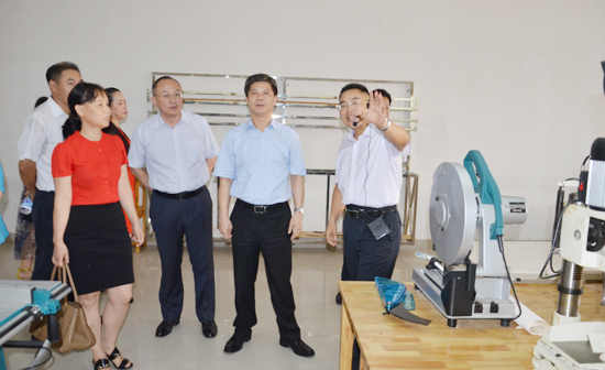 李荐国、杨懿文一行首先现场考察了学校实验实训室建设及校园环境。随后,现场办公会在我校主教学楼二楼报告厅举行。