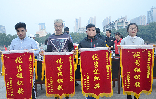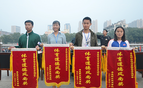 总裁判长王云飞宣读了第十六届田径运动会各类奖项:经过三天的激烈角逐,护理学院摘得团体总分桂冠,第二至六名分别由会计学院、经济管理学院、电子信息工程学院、机电工程学院、汽车学院获得;资源工程学院、文化传播学院、农林工程学院、艺术设计学院获得体育道德风尚奖;医药技术学院、五年制高职部、土木工程学院、会计学院获得优秀组织奖;护理学院、电子信息工程学院、经济管理学院、汽车学院、文化传播学院、机电工程学院获得“优秀领队”称号;护理学院、电子信息工程学院获得开幕式表演项目一等奖,经济管理学院、机电工程学院获得二等奖;王国平、谢钢、肖吉清、李景亮、欧凡、曾智、吴雪辉、李飞轮获得“教师优秀裁判员”称号:朱莹、繆文广等10人获得“学生优秀裁判员”称号。与会领导为他们颁奖。