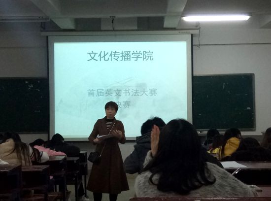 11月16日,文化传播学院在主教楼210教室举办首届英文书法大赛,出席本次大赛的有文化传播学院院长刘燕、副院长贺建良、肖付良和来自各班的参赛同学。